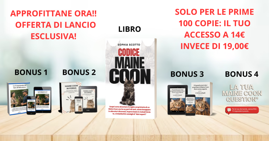 Clicca qui sotto e ordina ora la tua copia di Codice Maine Coon + Bonus + Consulenza Inclusa a soli 14€.