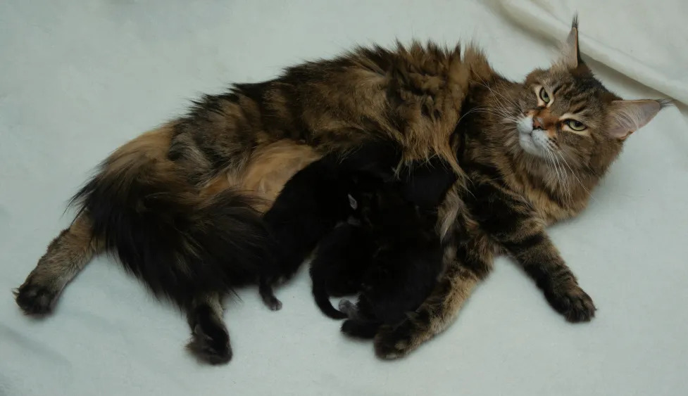 I cuccioli di Maine Coon nascono, come tutti i gattini, ciechi, sordi e completamente dipendenti dalla madre. Pesano in media tra i 90 e i 120 grammi e sono incredibilmente fragili.