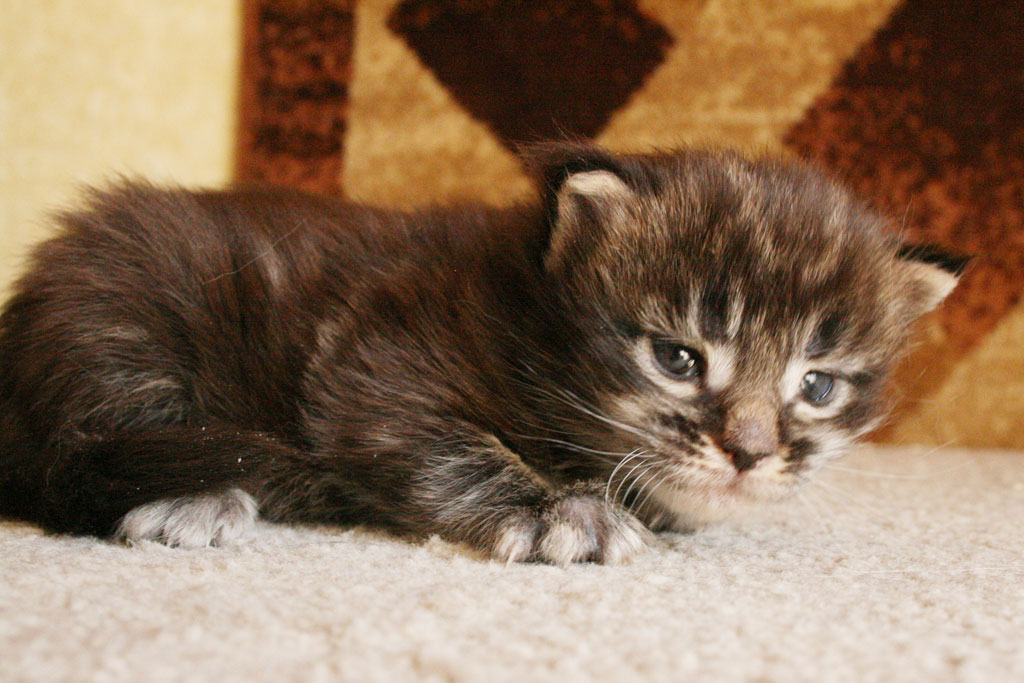 I Maine Coon si distinguono già per le loro dimensioni superiori rispetto ai cuccioli di altre razze. Inoltre il loro pelo inizia ad allungarsi, soprattutto sulle zampette e sul collo, avranno quindi un aspetto vaporoso e voluminoso. In questo periodo inoltre la mamma dedica molto del suo tempo a pulire i suoi piccoli.